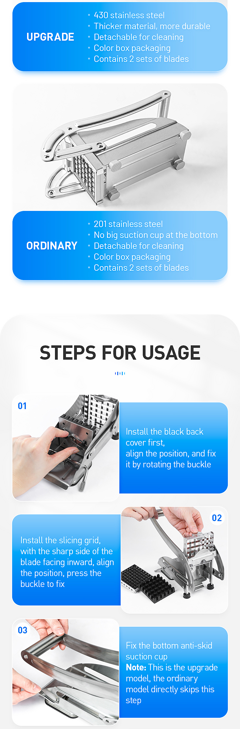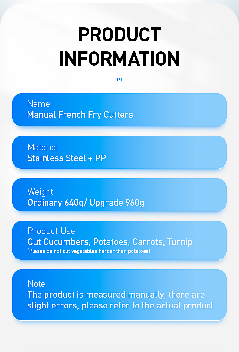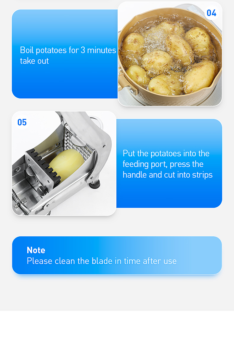 При использовании этой резки картофеля, пожалуйста, нарежьте картофель или фрукты и овощи на две половинки, самолет лицом вниз, и сила должна быть даже при нажатии, и вы не можете нажать с взрывной силой. Чрезмерная сила легко повредит лезвие.