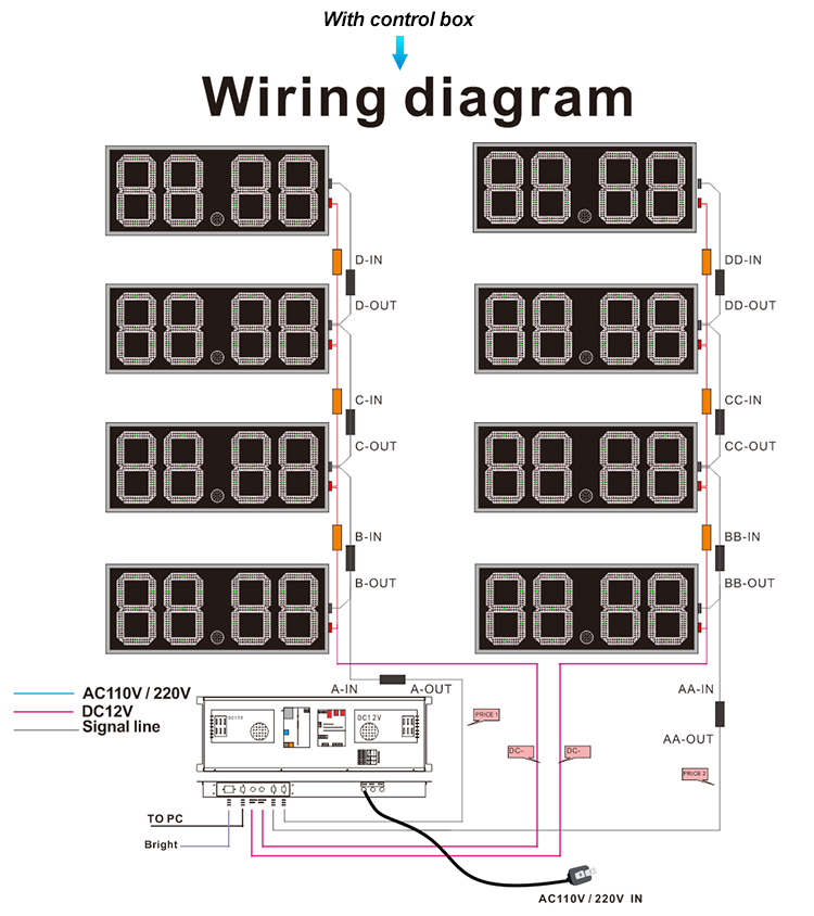 Вопрос 2: все светодиодные цифры не являются освещением. Некоторые светодиодные знаки контролируются вместе, но только знак, который имеет контрольную (основную) карту, может работать, другие знаки не могут работать.