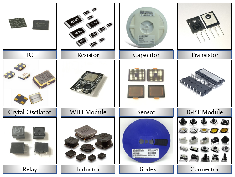 IC является общим термином для полупроводниковых компонентов продукции. В том числе: 1. Интегральная плата (интегральная схема, Аббревиатура: IC); 2. Диод и Триод; 3. Специальные электронные компоненты. В более широком плане он также включает в себя все электронные компоненты, такие как резисторы, конденсаторы, печатные платы/платы PCB и многие другие сопутствующие продукты.
