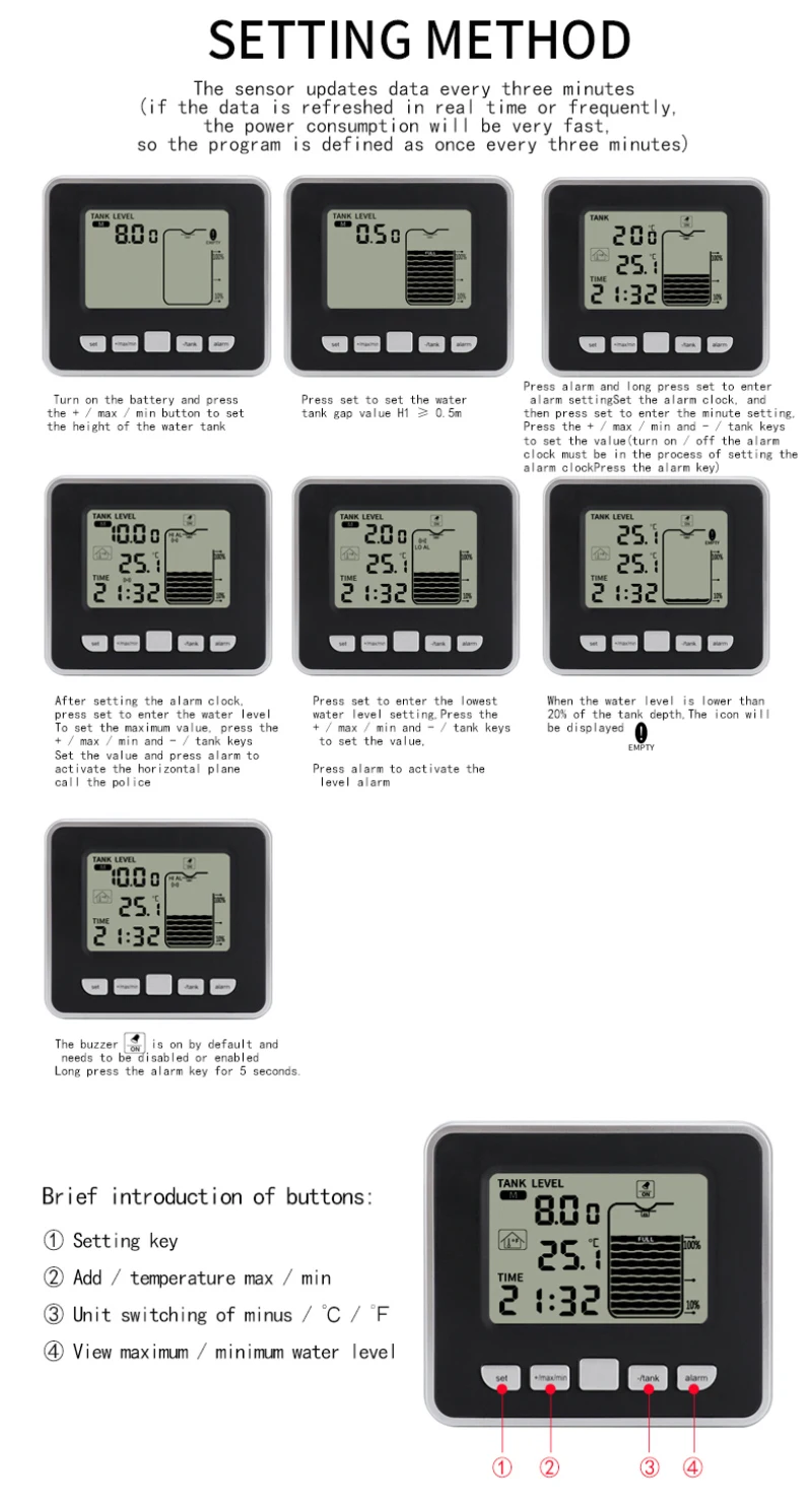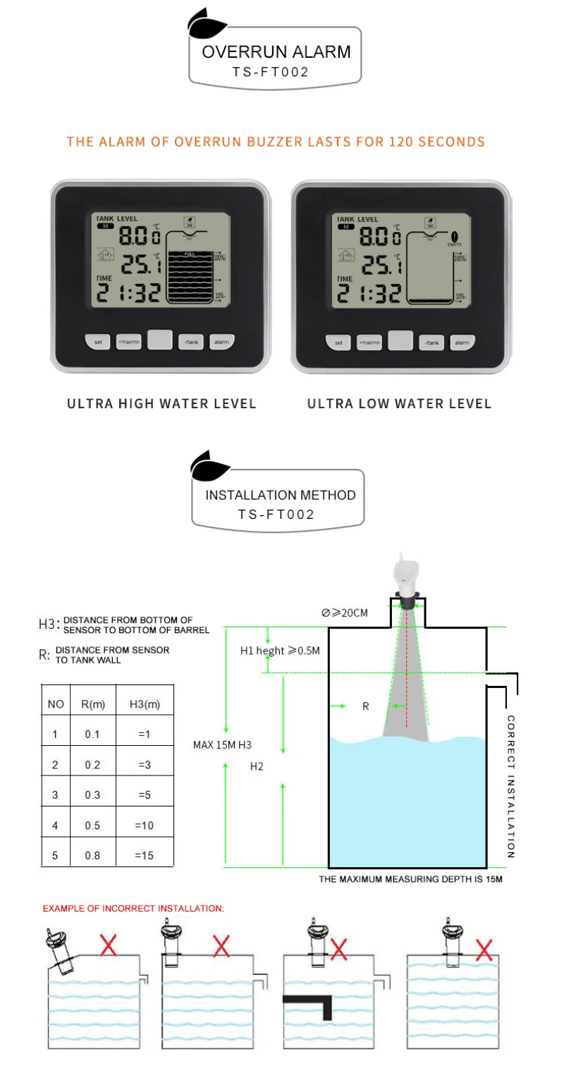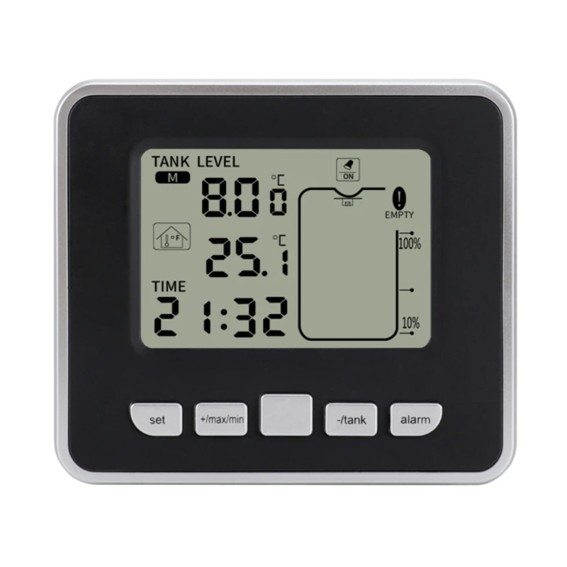【Convenient для Use】The уровня воды Сенсор-приемник может быть размещён на столе или повесить на стену для того чтобы контролировать глубины танка и показан на 10-элемент ЖК-дисплей гистограмма.