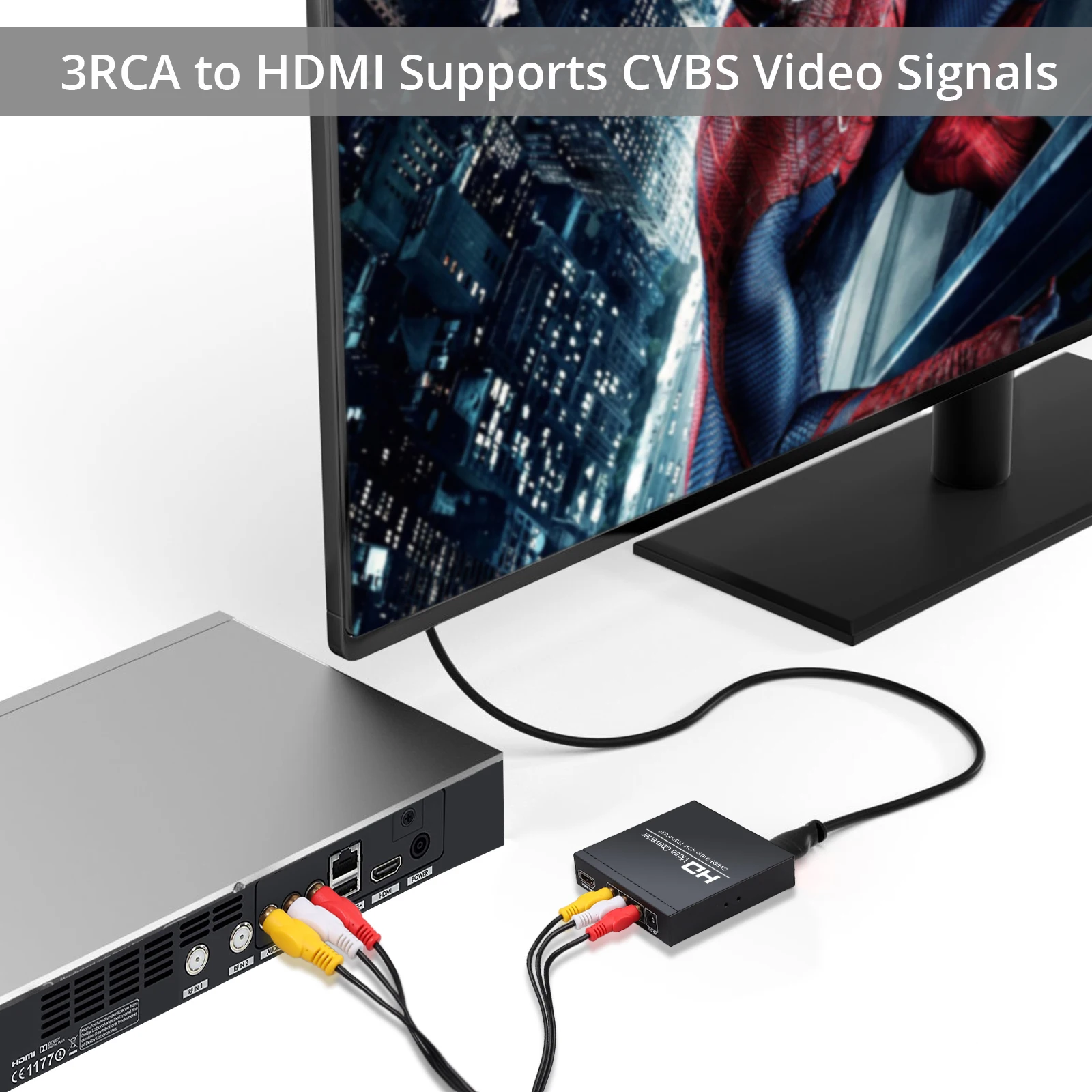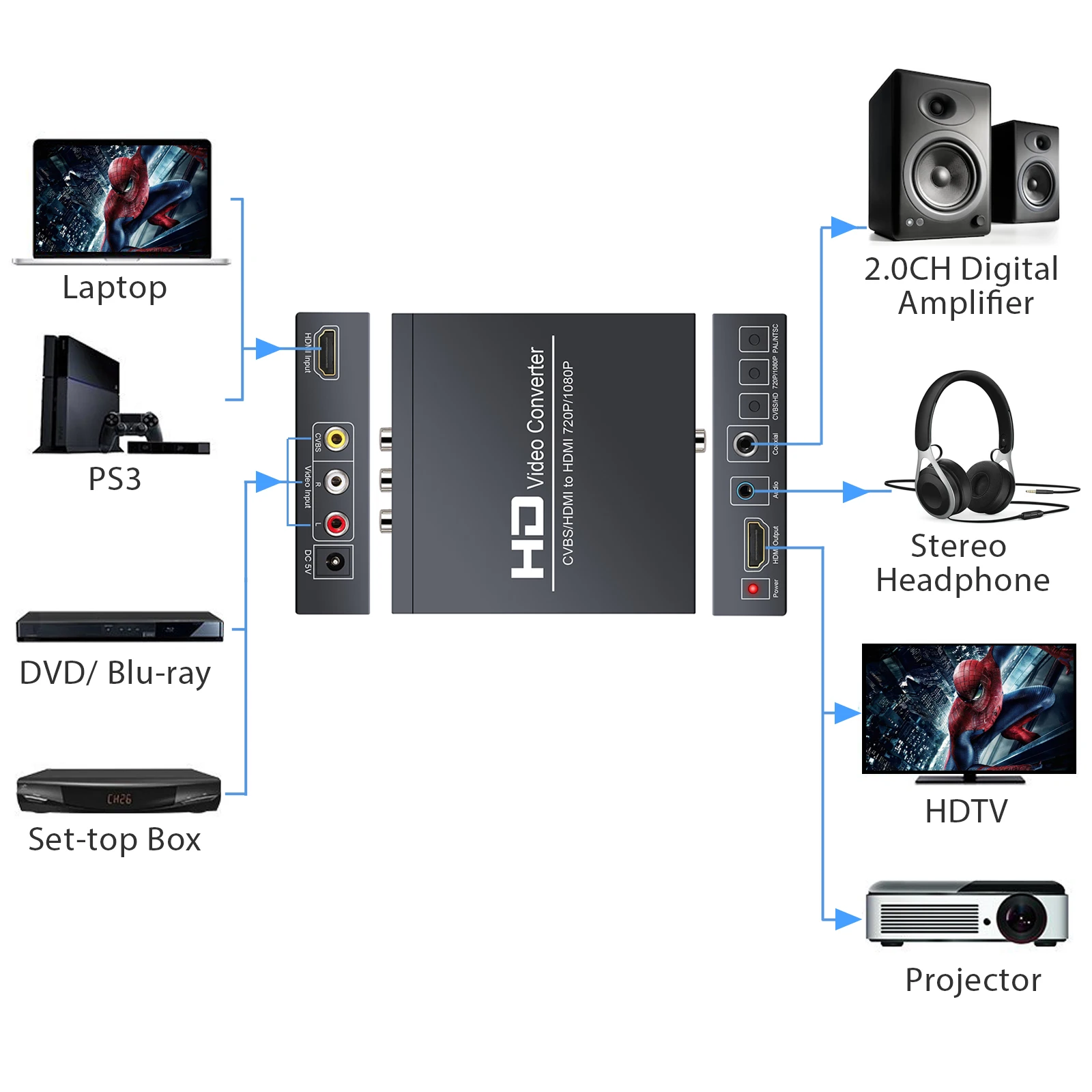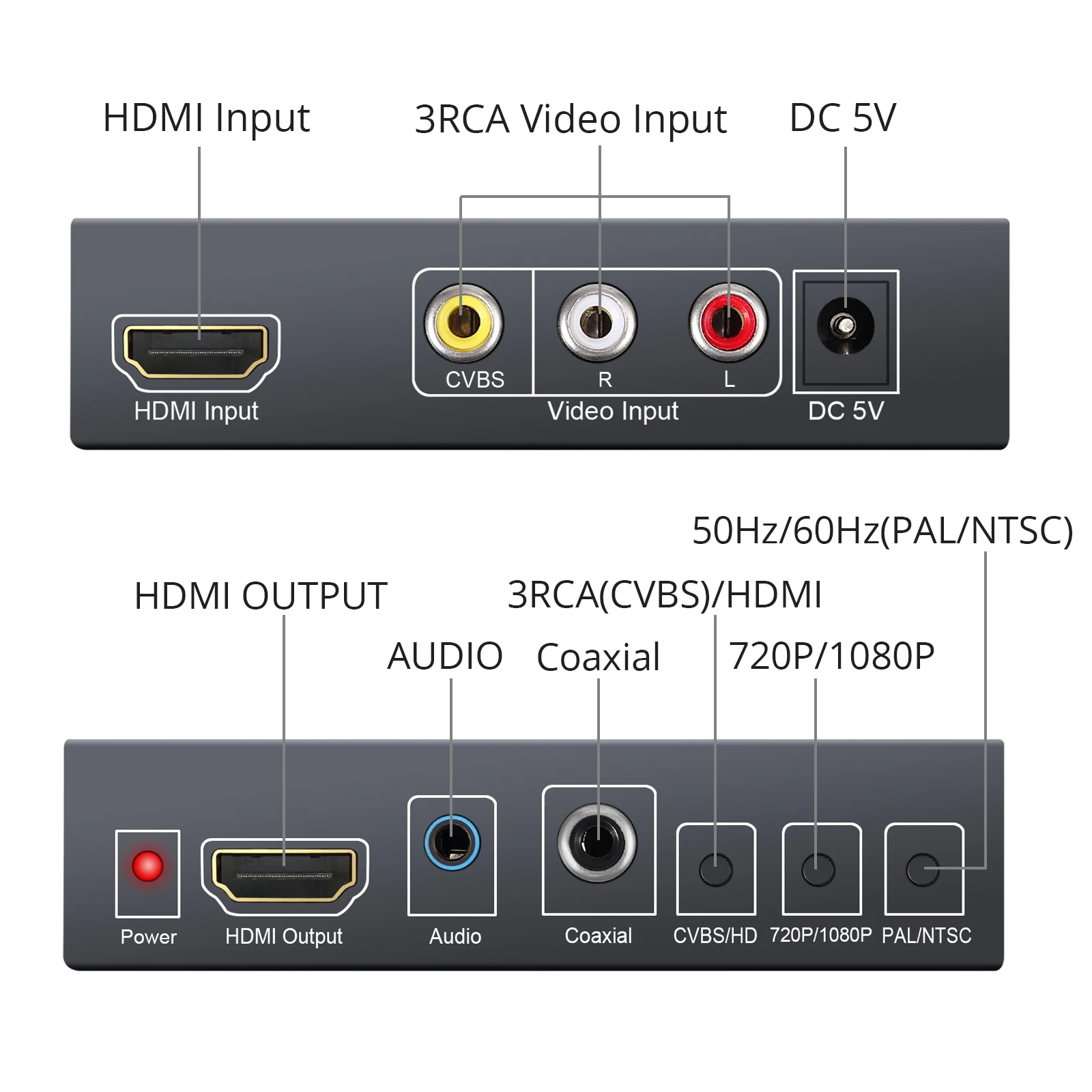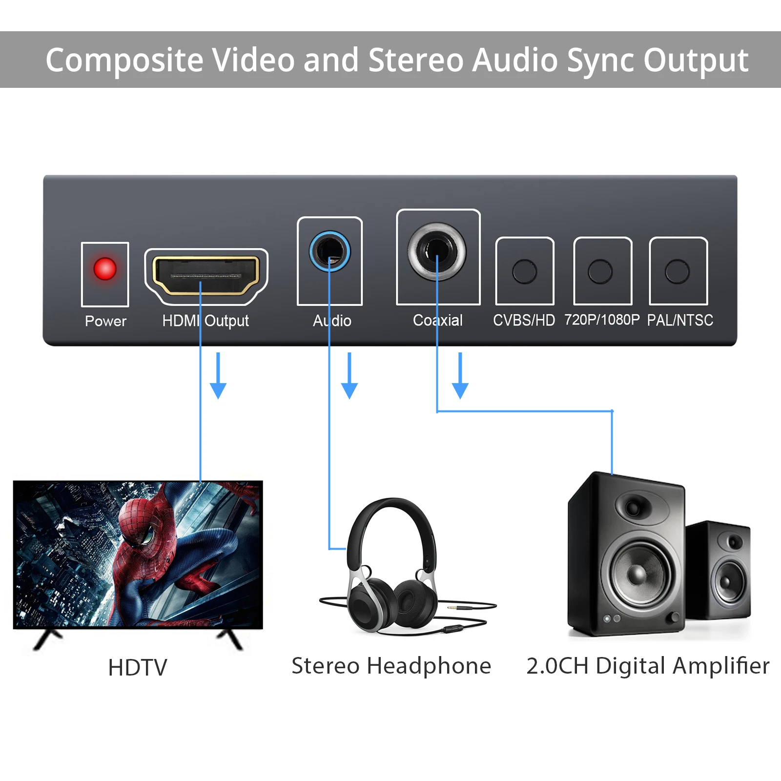 1. Поддерживает композитные видеосигналы в HDMI цифровые видеосигналы и 3,5 мм наушники/цифровые коаксиальные стерео аудио сигналы с улучшенными помехами изображения и стабильностью передачи