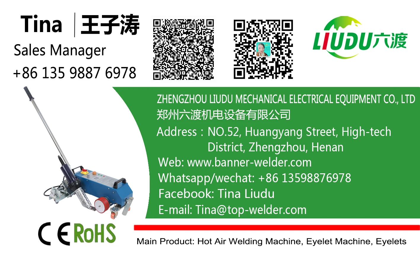 Почему стоит выбрать нас?· Экспортируется в 68 стран и регионов· 19 национальных патентов· Фокусировка на сварке горячим воздухом и люверсах· Профессиональная R & D команда· Гарантия качества и своевременная доставка· Своевременное послепродажное обслуживание· 1 год гарантии, пожизненное техническое обслуживаниеКонтактная информация