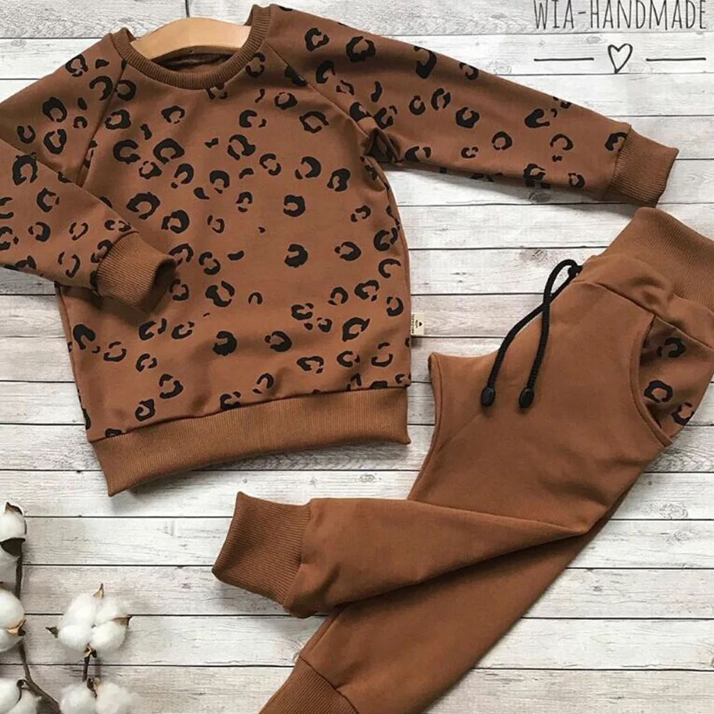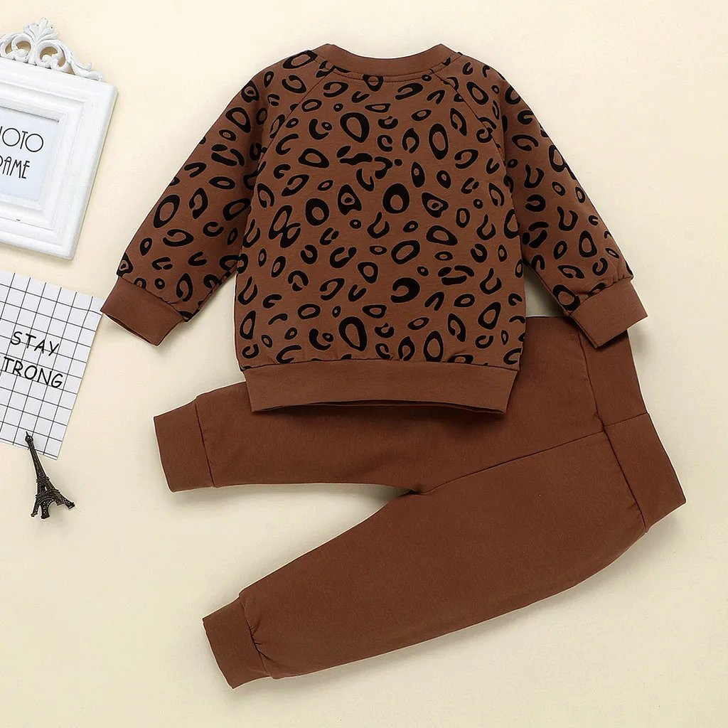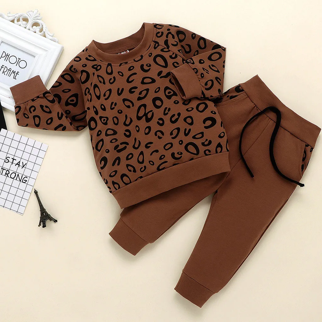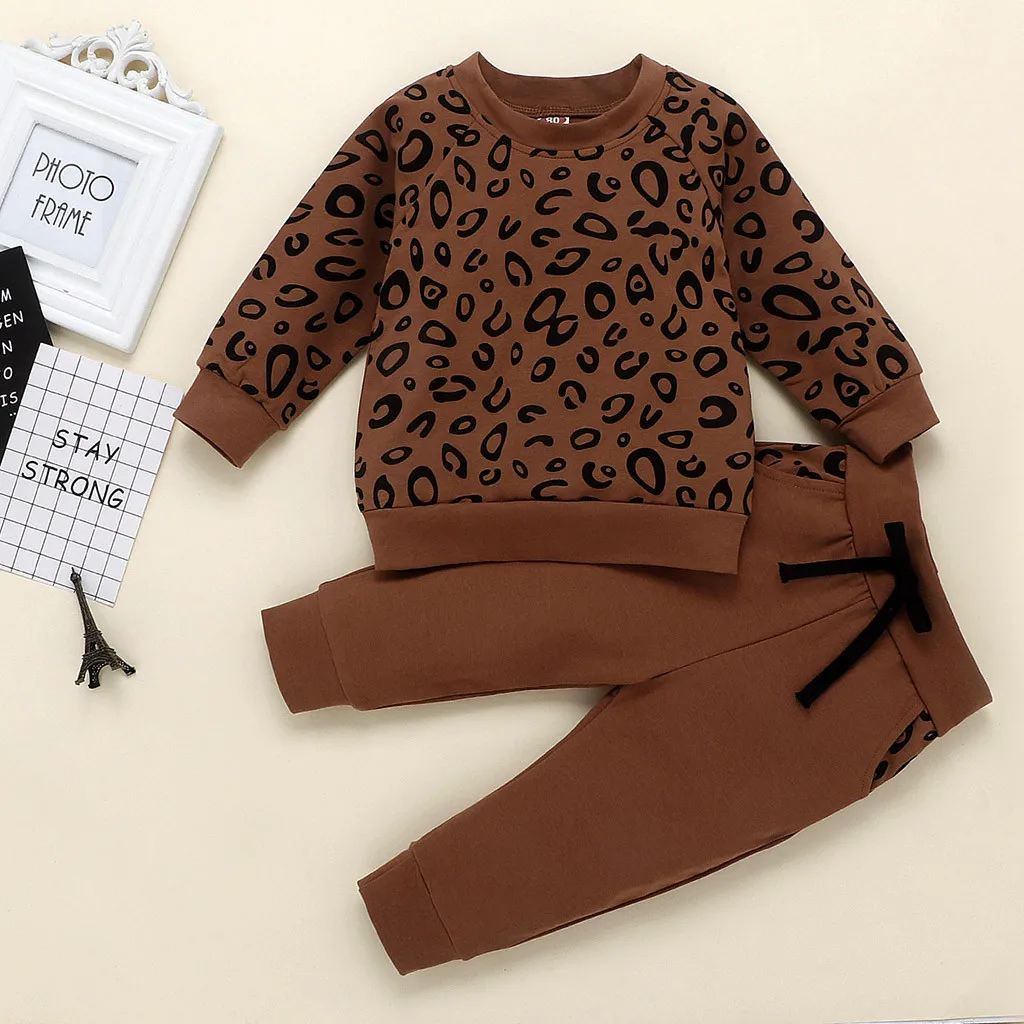 Одежда для маленьких мальчиков и девочек модный Леопардовый топ с длинными рукавами для мальчиков, милые однотонные штаны Детский костюм для мальчиков комплект из 2 предметов