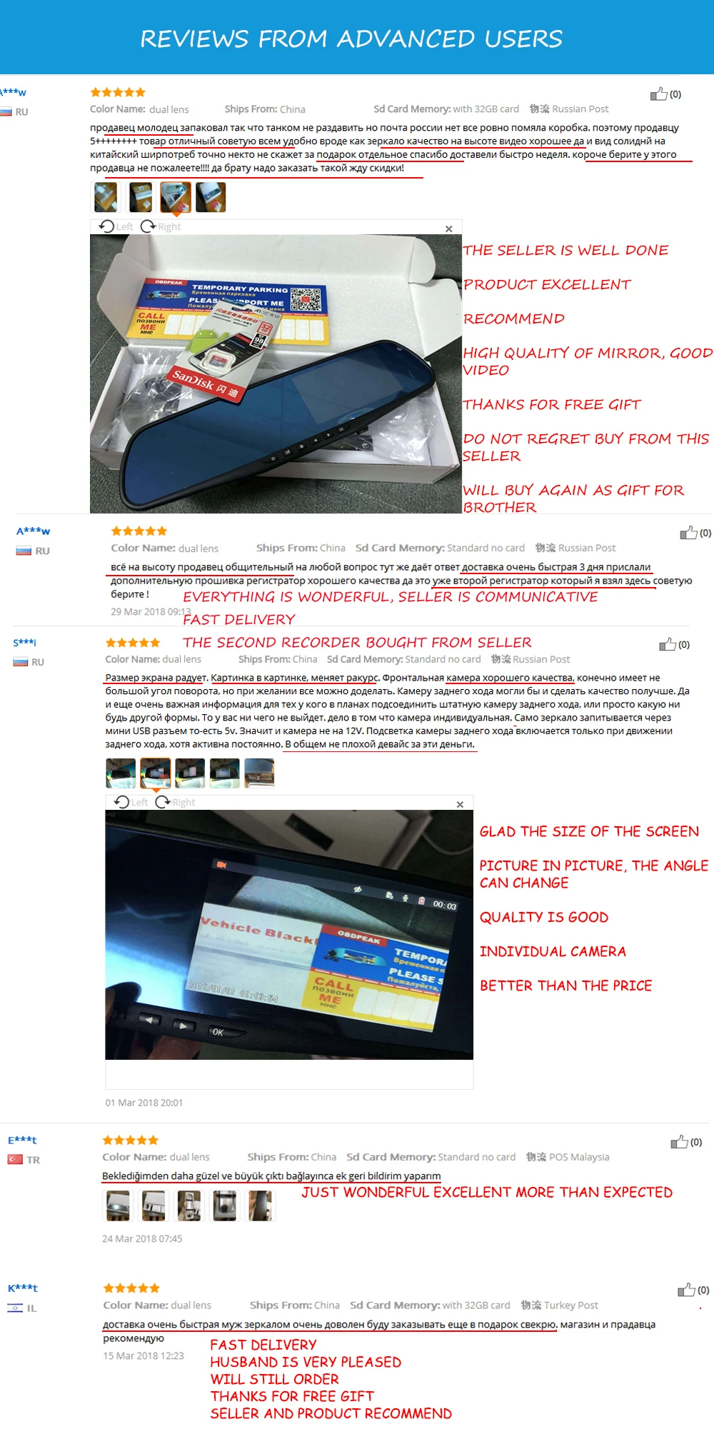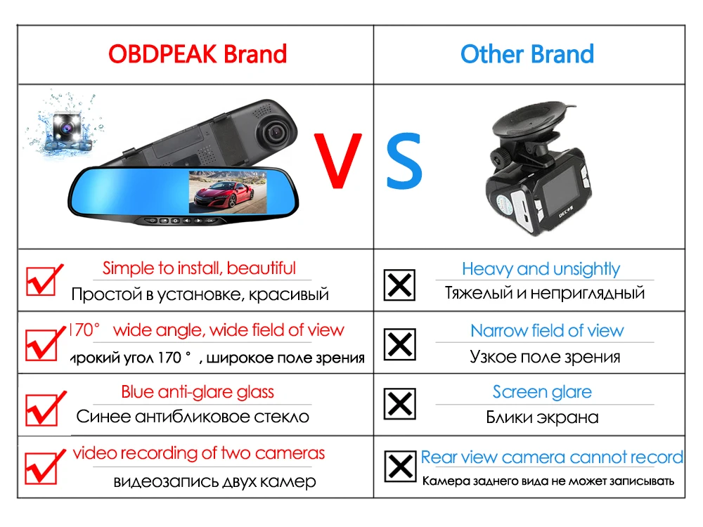 О: Мы являемся ведущим брендом, имеющим лучшие заказы на это Зеркало автомобильного видеорегистратора. И мы используем только полную 6 слоев объектива камеры заднего стекла все время. Некоторые перепродавцы используют пластиковые Объективы для камеры, поэтому они могут снизить $3-$5 за это Зеркало автомобильного видеорегистратора. Но если вы используете пластиковый видеорегистратор с объективом камеры, видео и изображение будут размытыми при горячей температуре из-за термического искажения пластикового объектива.