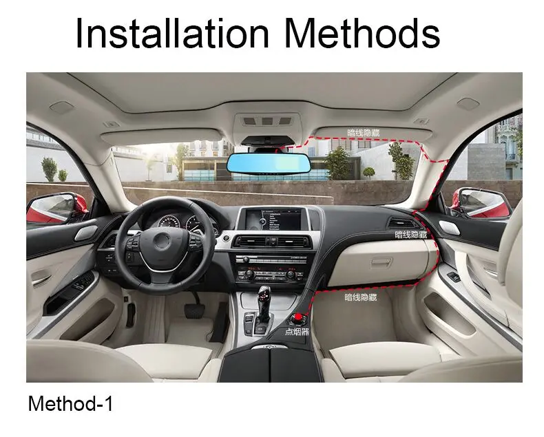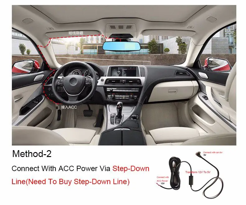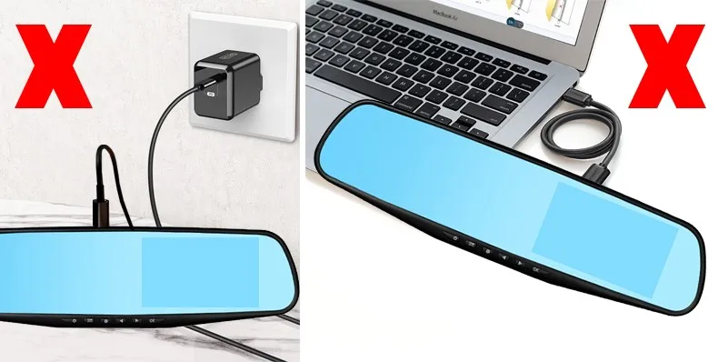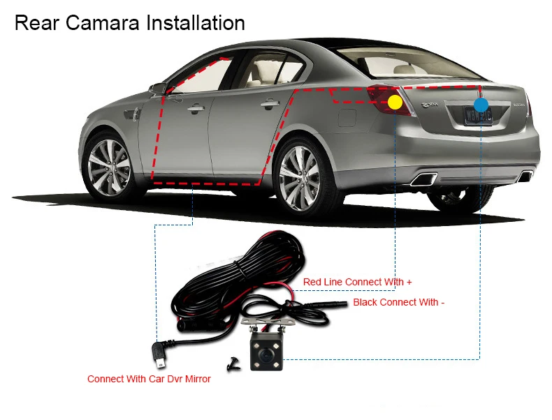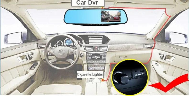 Пожалуйста, подключите красный кабель задней камеры к положительному полюсу питания вашей автомобильной фары заднего вида (+). А затем Подключите автомобильное зарядное устройство к прикуривателю для питания автомобильного видеорегистратора.