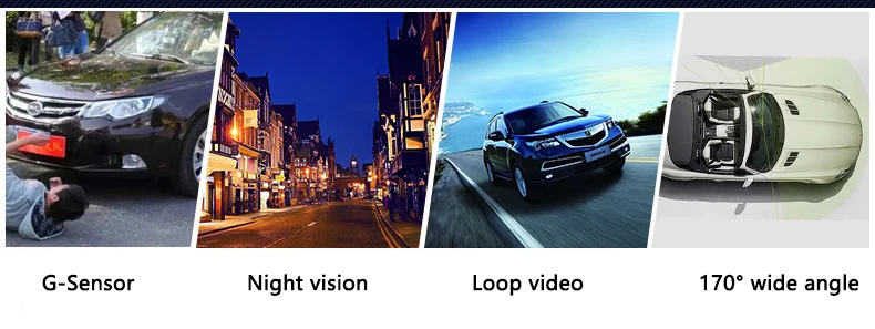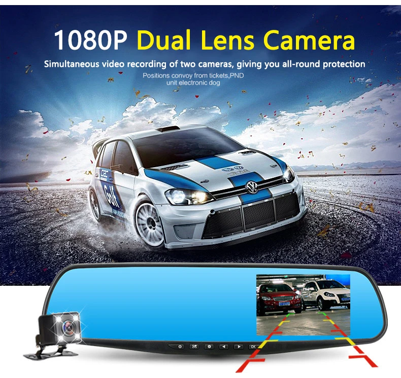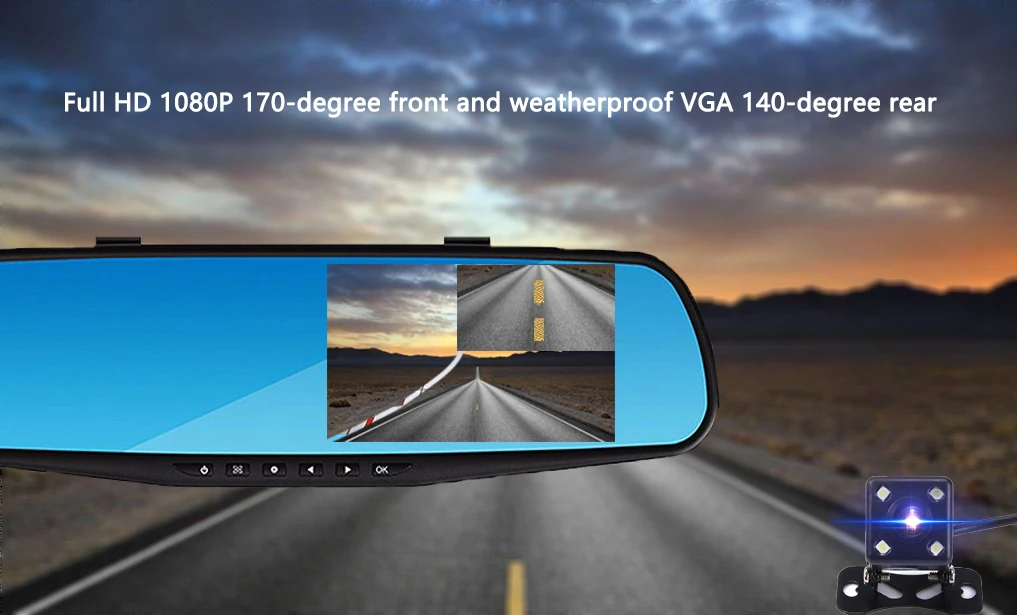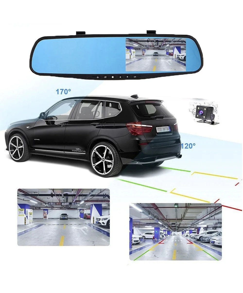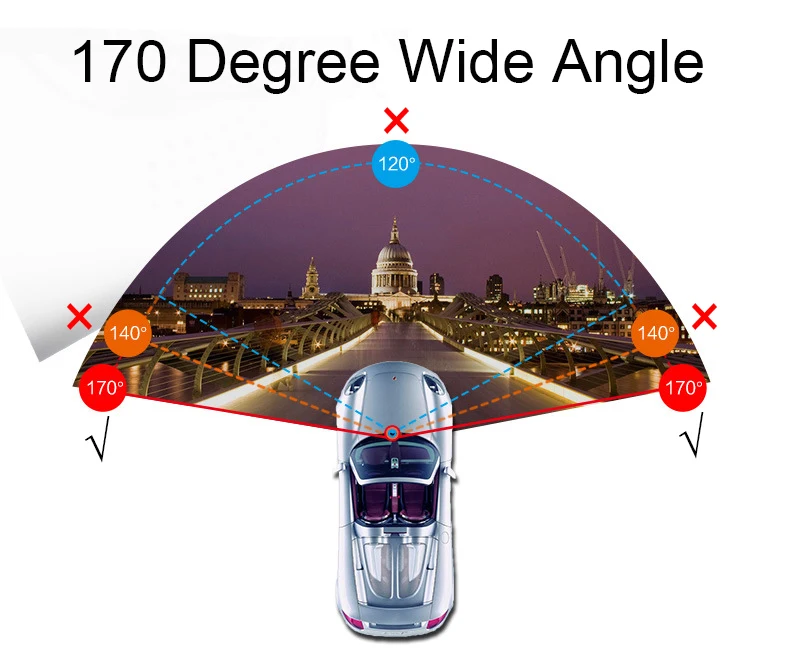 Когда автомобиль на заднем ходу, этот видеорегистратор автоматически переключается на просмотр изображения с камеры заднего вида, Передняя камера имеет ширину 170 градусов, задняя камера-140 градусов
