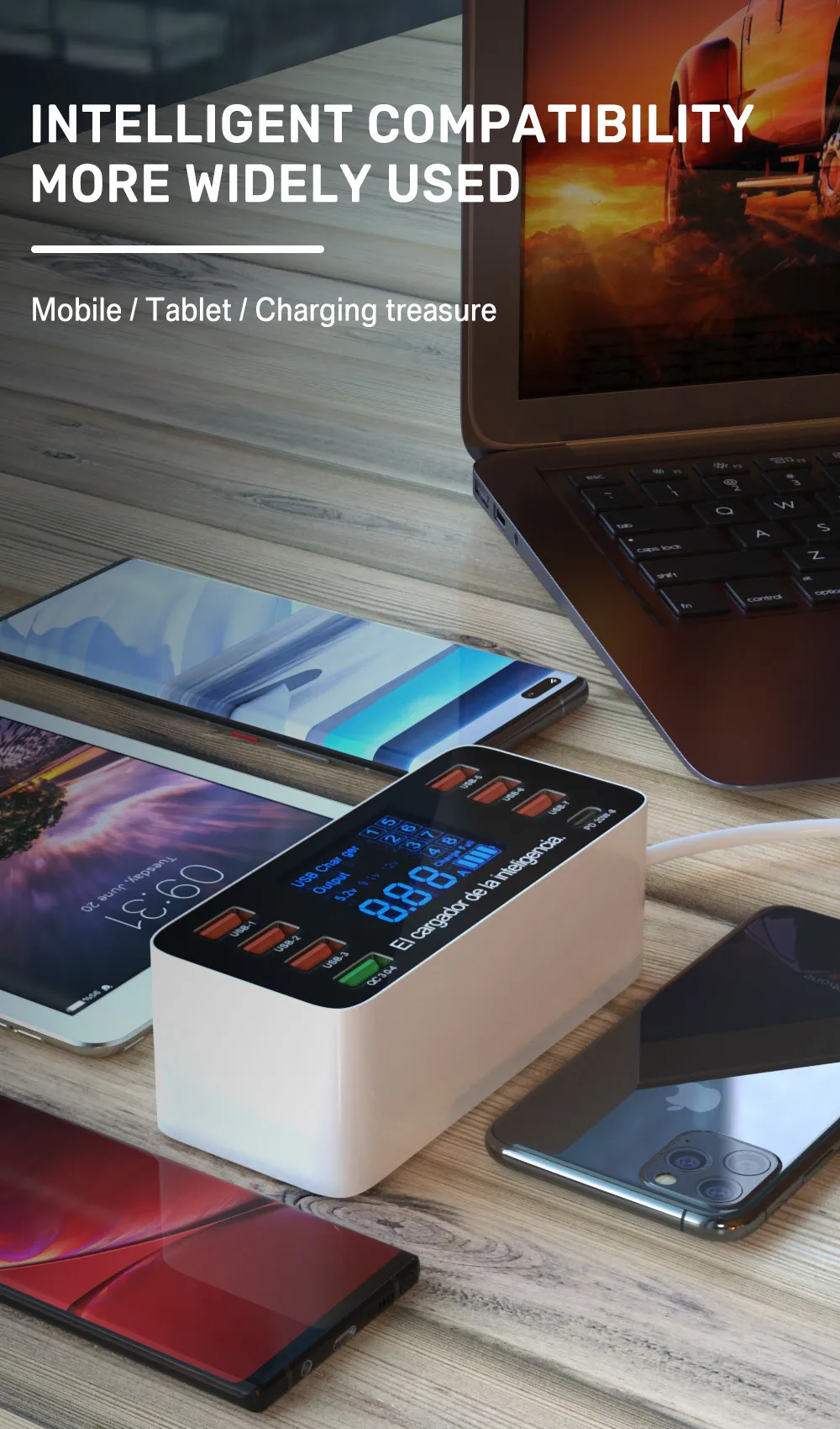 1. Идеально подходит для дома, офиса, путешествий и других помещений 2. 8 портов USB с различной выходной емкостью и 1 порт PD3.0 type c для удовлетворения ваших потребностей и 1 быстрая зарядка USB QC3.0 3. Совместим со всеми смартфонами, такими как iphone, Samsung, Xiaomi, Huawei, LG, ZTE, Lenovo, HTC, Sony, Google, и Планшетными ПК, камерой, MP3, MP4 плеером, PSP с портом USB, и портом type c для Macbook. 4. Заряжайте до 8 устройств одновременно. 5. Поставляется со светодиодным дисплеем, чтобы четко показать состояние зарядки, поставляется с умным светодиодным экраном для проверки состояния 6. Компактный дизайн, небольшой размер и легкий вес 7. Автоматическое соответствие тока, больше защиты