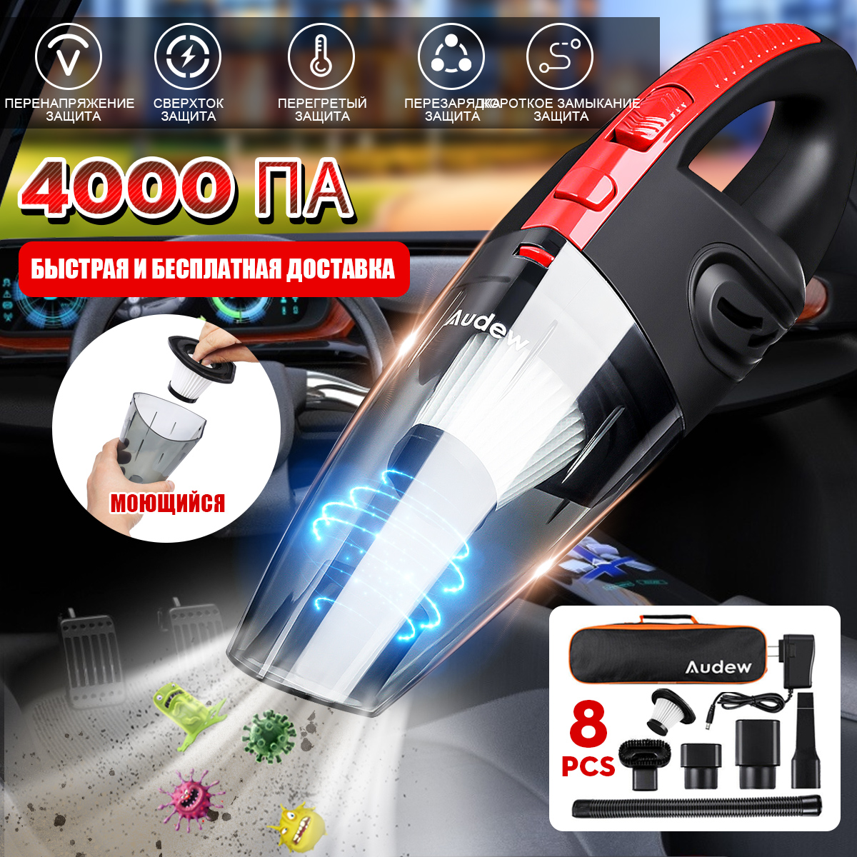Название продукта Портативный пылесос AUDEW Рабочее напряжение 100В-240В Настоящий воздух 4000 Па Номинальная скорость 29000-31000 об/мин Емкость аккумулятора 2200 мАч Номинальная мощность 120 Вт Длина шнура питания Около 1 м Вес посылка 0,720 кг Размер упаковки 355 мм * 105 мм * 125 мм Фильтр Моющийся и съемный HEPA фильтр Тип обслуживания Ежедневная быстрая очистка для кухни, дома, автомобиля, офиса...
