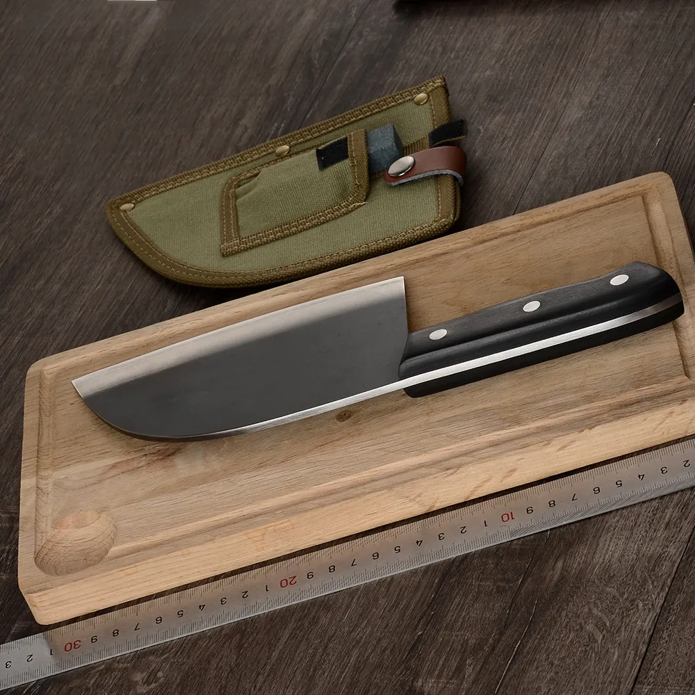 Вес ножа: около 483 г Ширина лезвия: около 100 мм Длина лезвия: около 165 мм Толщина лезвия: около 3,5 мм Стиль ручки: полная ручка Tang Материал лезвия: высокоуглеродистая Нержавеющая сталь 7cr17 ручной работы Материал ручки: полностью интегрированный Стальной хвостовик + дерево + заклепки Материал оболочки: кожа, нейлон