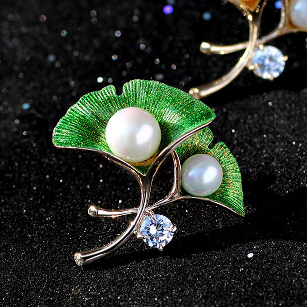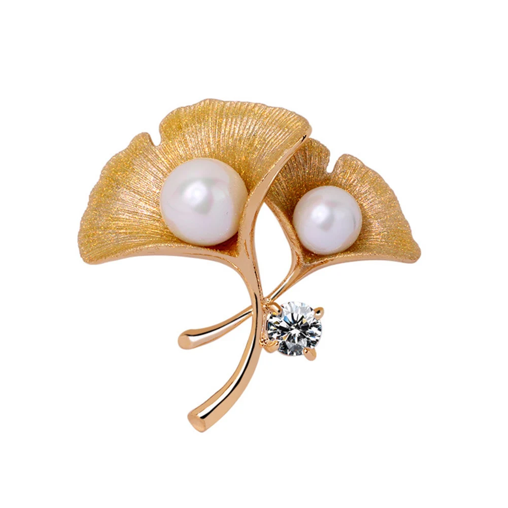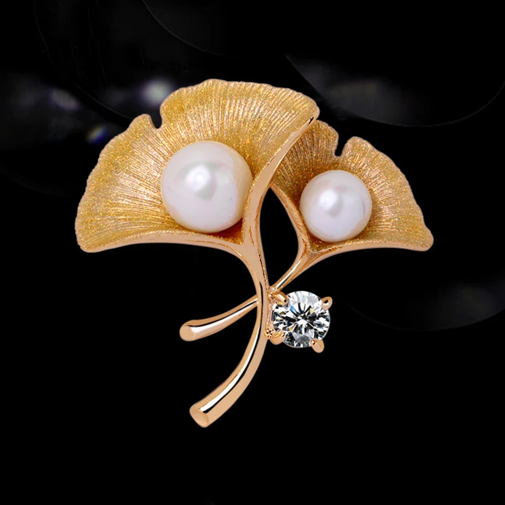 Fashion Women Cubic Zirconia Faux Pearl Ginkgo Leaf Brooch Pin Badge Lapel Decor
